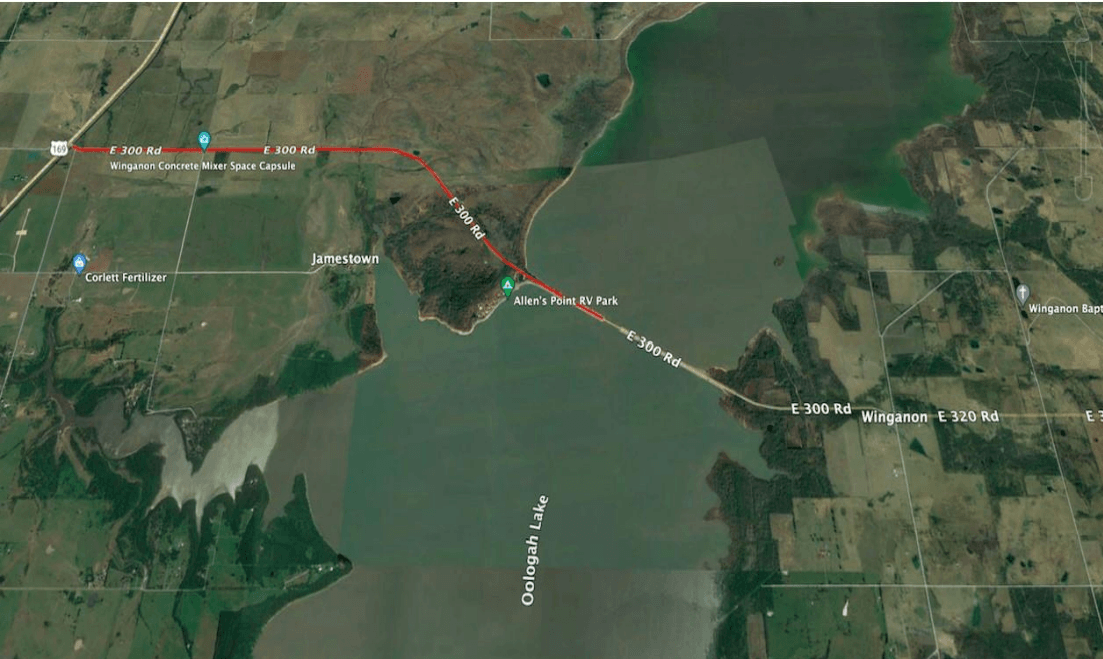 May 2025 update: The project is more than 73% complete. The contractor will plan to close two sections of E. 300 Road west of the Winganon Causeway for pavement removal and replacement beginning May 27, 2025. The completion date has not yet been established.